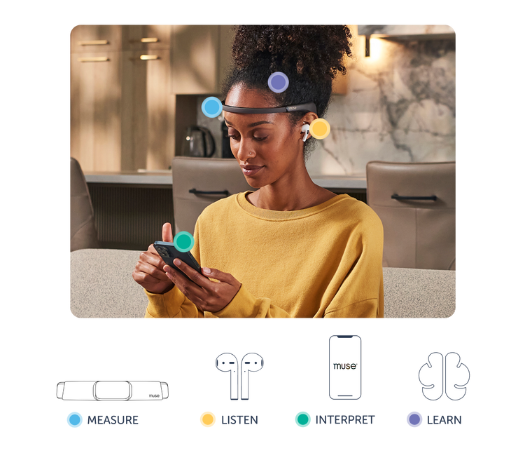During your meditation, these gentle audio cues give you immediate feedback on your heart rate, breathing patterns, body movement and brain activity.