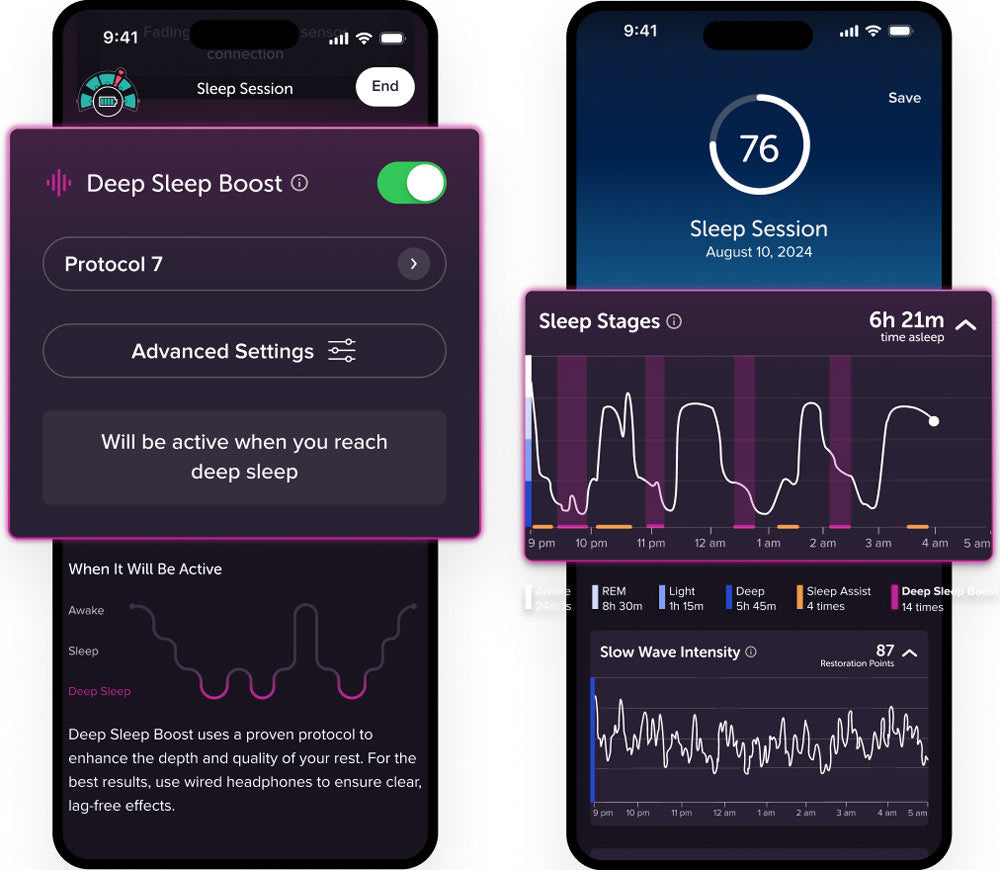 Deep Sleep Boost uses real-time EEG to detect deep sleep, then delivers precisely timed sound cues to reinforce slow-wave rhythm when your brain is ready.