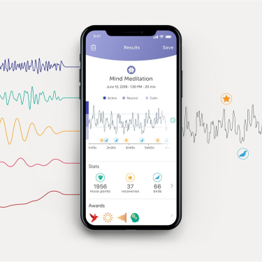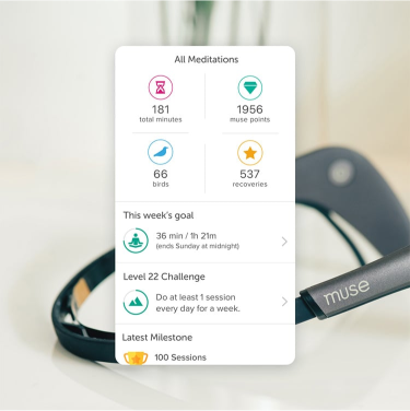 Guided meditations completed with the Muse brain-sensing headband allow users to track their brainwaves during their session. Post-session graphs show the amount of time brainwaves are inactive, neutral, and calm states.