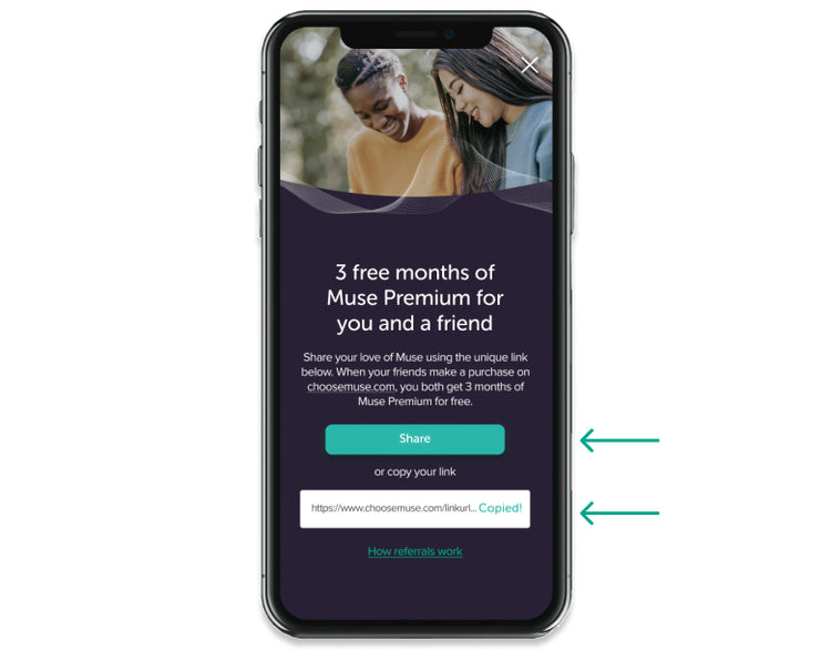 Copy your unique referral link and share with your friends and family to give them 3 months of premium subscription for free with their purchase of a Muse or Muse Bundle.