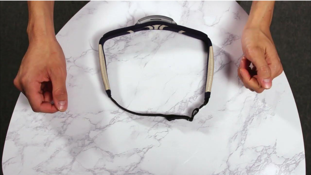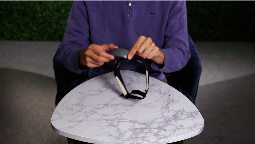 To prepare to put on the headband, ensure the Muse logo is facing right side up. The pod in the middle of the band will be facing out and the beige forehead sensors will be facing you. The beige ear sensors that run along the side of the band will face down and will sit behind your ears once on.